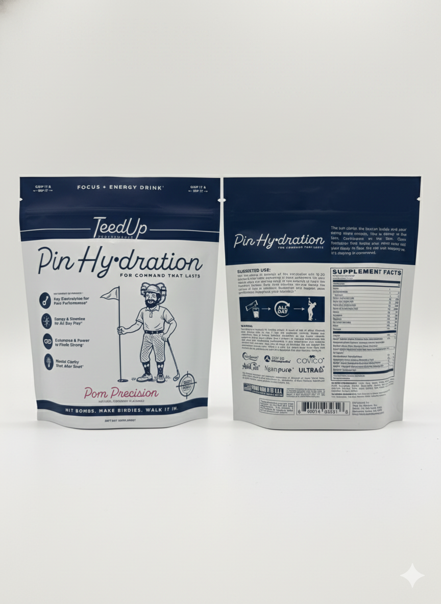 We were honored to partner with TeedUp Performance on soft-touch, full-color stand-up pouches for their golf-focused supplements, Pin Hy’dration and Cognitive Caddy. These 8.25" × 10" × 3.5" pouches are produced on a 0.56 mil soft-touch PET / 3.0 mil white stick-pack web structure, with a resealable zipper, bottom gusset for strong shelf presence, and plenty of space for supplement facts, barcodes, and regulatory copy—helping the brand look sharp on the shelf and travel easily in the golf bag. Big thanks to the TeedUp Performance team for trusting us with their packaging.